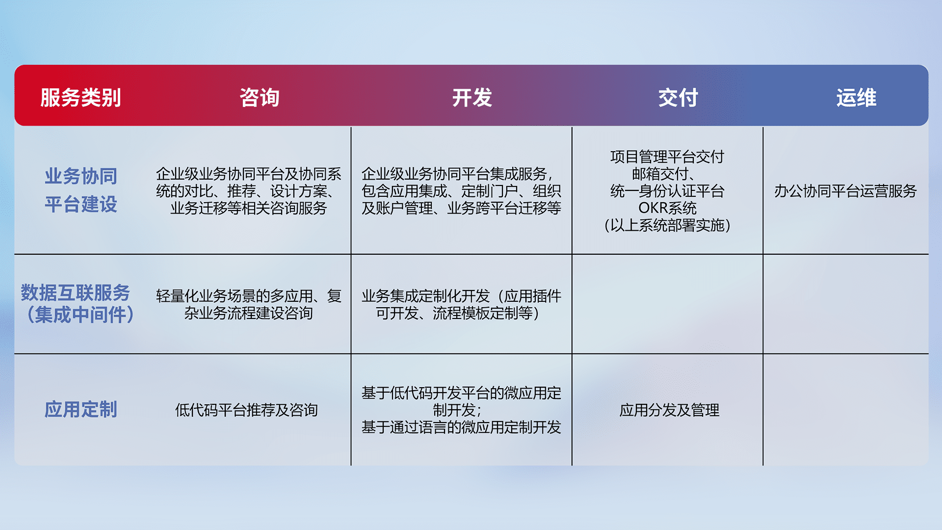 针对钉钉、、企微、、、、IDaas等平台级产品提供产品的规划、、、、方案、、交付、、定制化开发等服务,,,实现如统一协同办公、、、、智能客户服务、、混合会议管理、、、智能数据查询、、等业务场景,,,,实现数字化转型。。。。